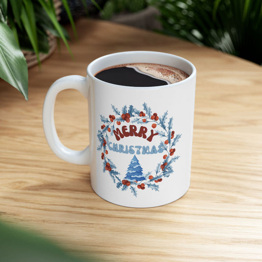 Merry Christmas Wreath Mug, Ceramic Wreath Coffee Mug, Holiday Wreath Mug, Christmas Wreath Coffee Mug, Christmas Wreath Mug, Wreath Mug, Ceramic Mug 11oz