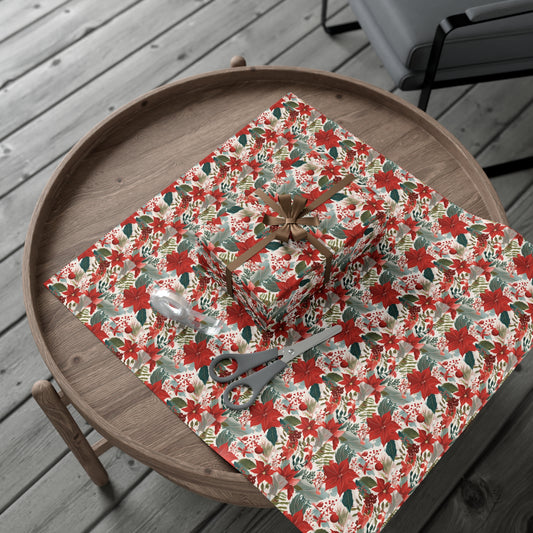 Red Poinsettia Christmas Wrapping Paper, Holiday Gift Wrap with Red Flowers & Greenery
