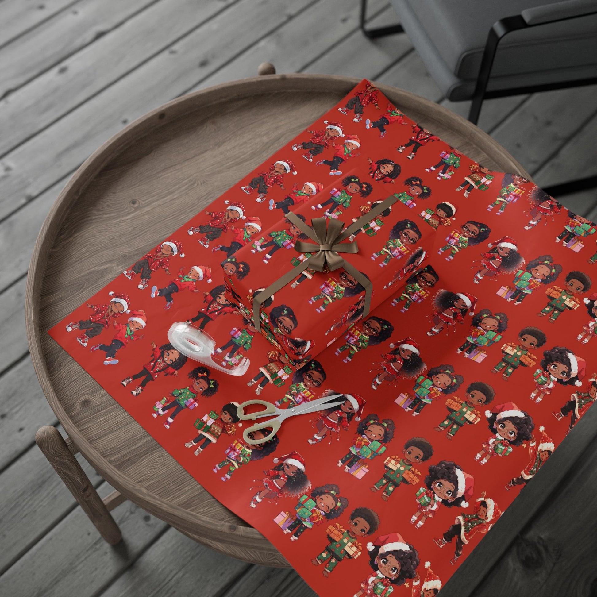 Add a touch of culture and joy to your holiday celebrations with our Afrocentric Christmas Wrapping Paper! This vibrant red gift wrap is adorned with adorable illustrations of children characters celebrating and giving Christmas gifts. Bringing festive cheer with a unique twist. Perfect for anyone looking to spread holiday joy while celebrating diversity, this wrapping paper is an ideal choice for Christmas presents, party favors, or holiday decor.