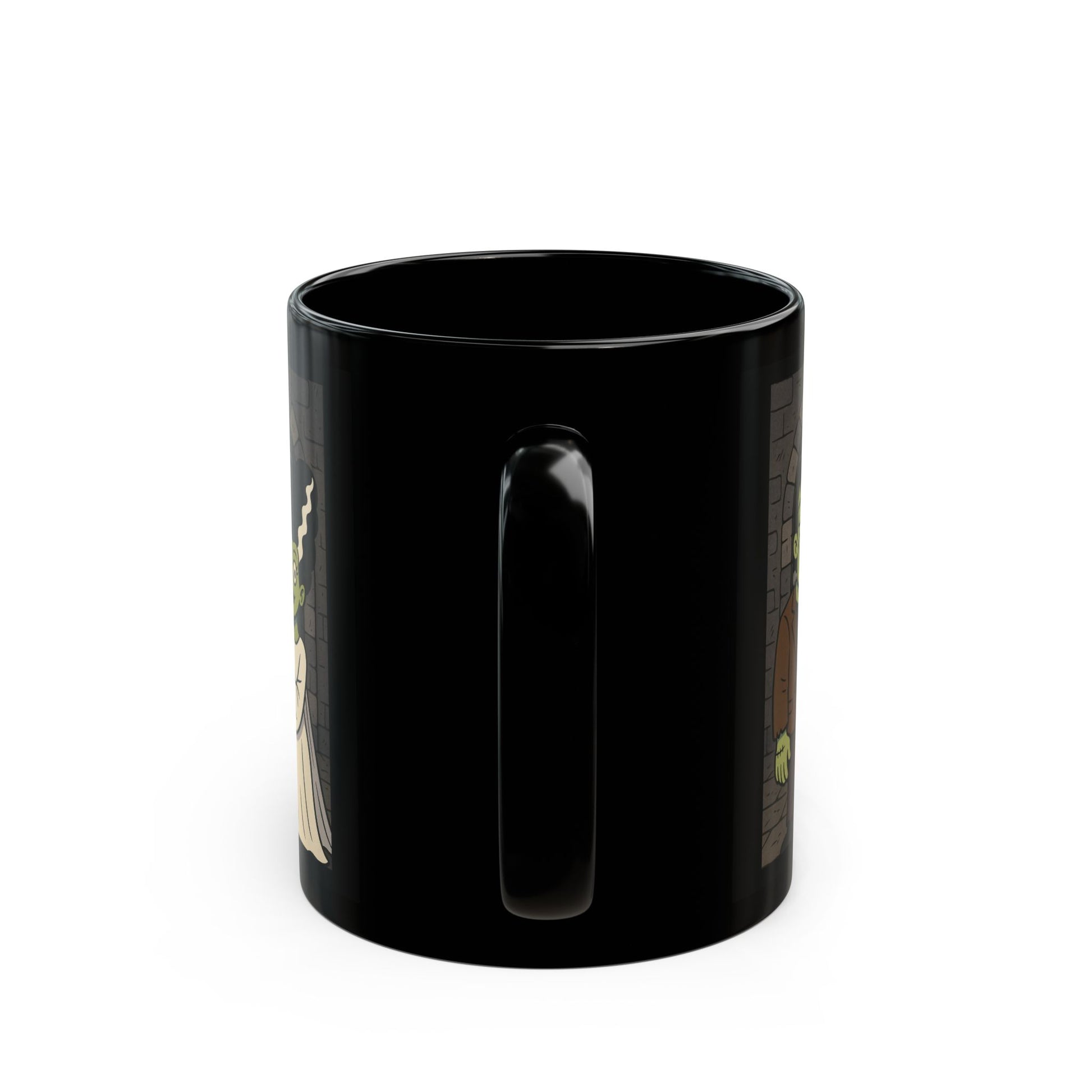 Bring a touch of spooky romance to your morning brew with this Frankenstein and Bride of Frankenstein mug! Featuring a fun cartoon-style design of the iconic monster couple standing together in front of a stone dungeon backdrop, this mug is perfect for adding Halloween vibes to your coffee, tea, or hot cocoa.