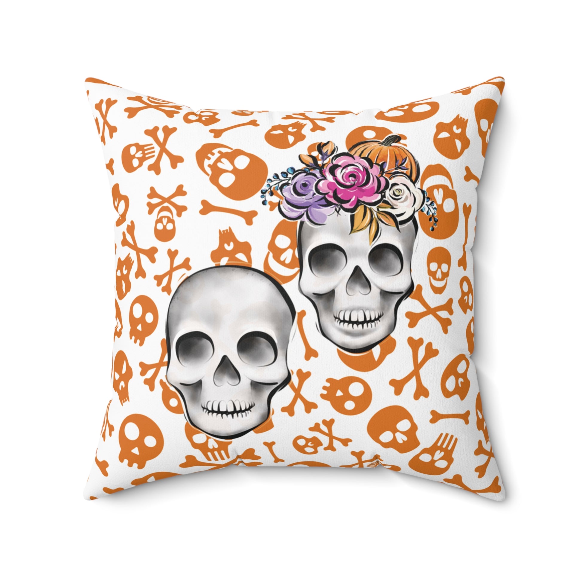 Add a touch of edgy elegance to your home décor with this unique skull-themed decorative pillow. The design features two detailed skulls, one adorned with a beautiful floral crown that blends gothic and floral elements seamlessly. The background is a playful orange and white pattern of skulls and crossbones, perfect for Halloween décor or year-round use for those who appreciate quirky, bold designs.