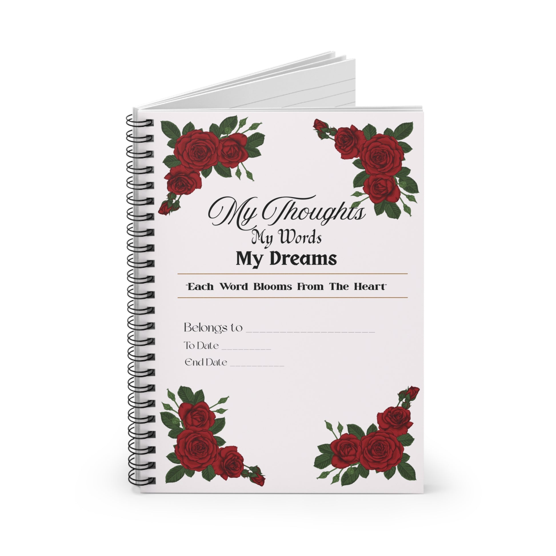 Adorned with rich red roses and the inspiring message “My Thoughts, My Words, My Dreams,” this spiral-bound notebook is a romantic and empowering space to capture ideas, reflections, and daily inspirations.