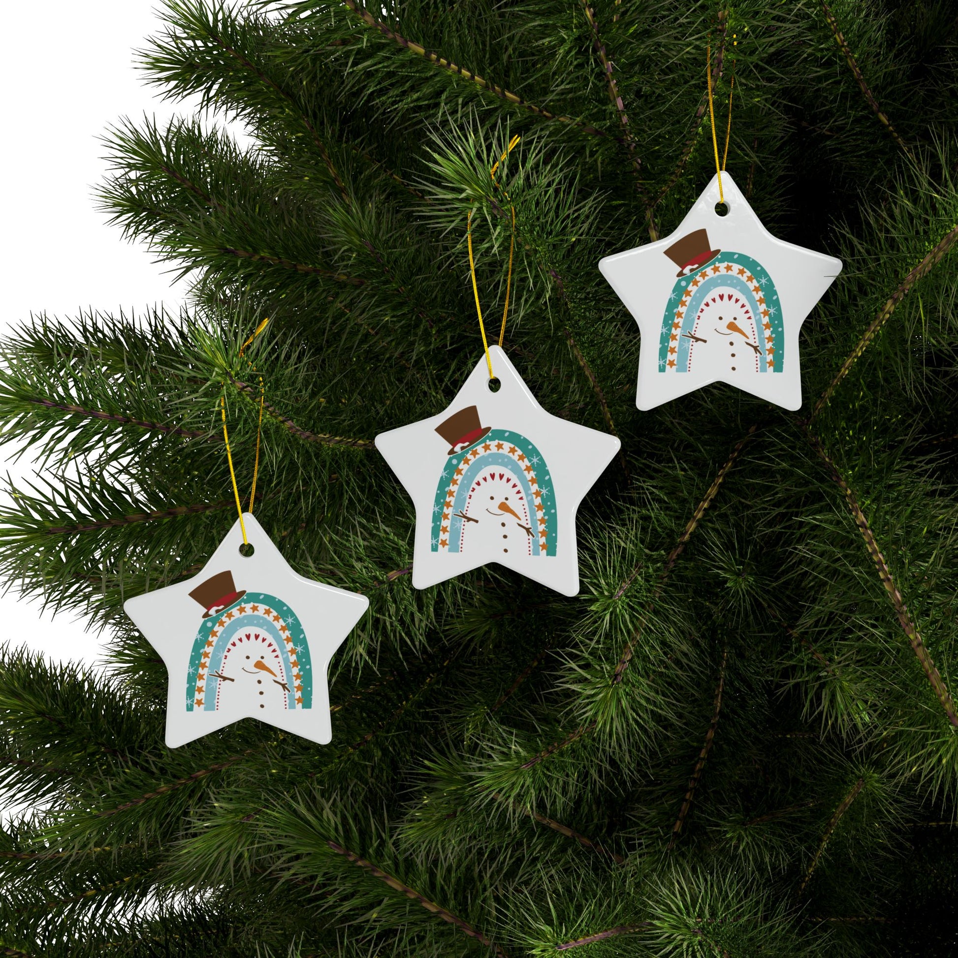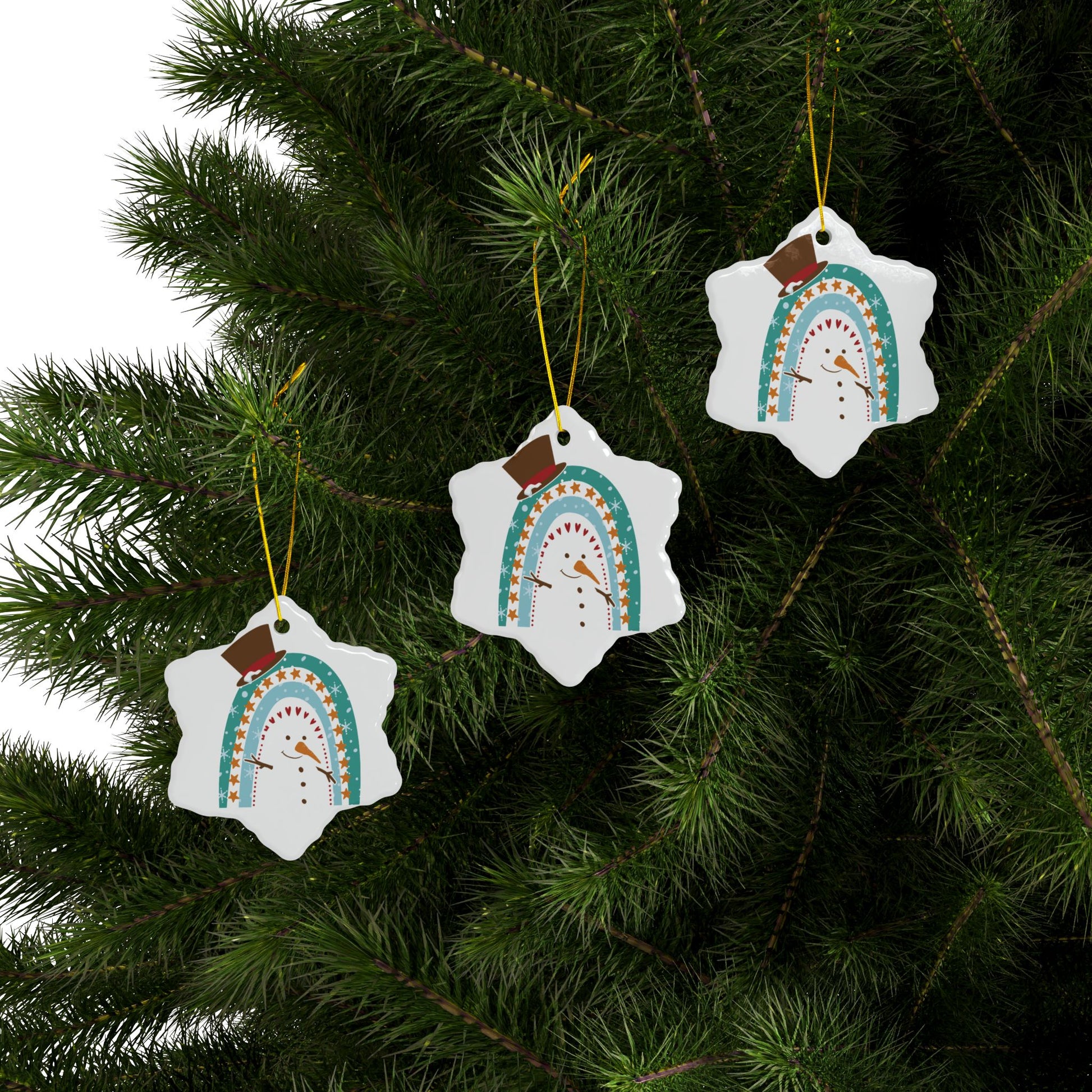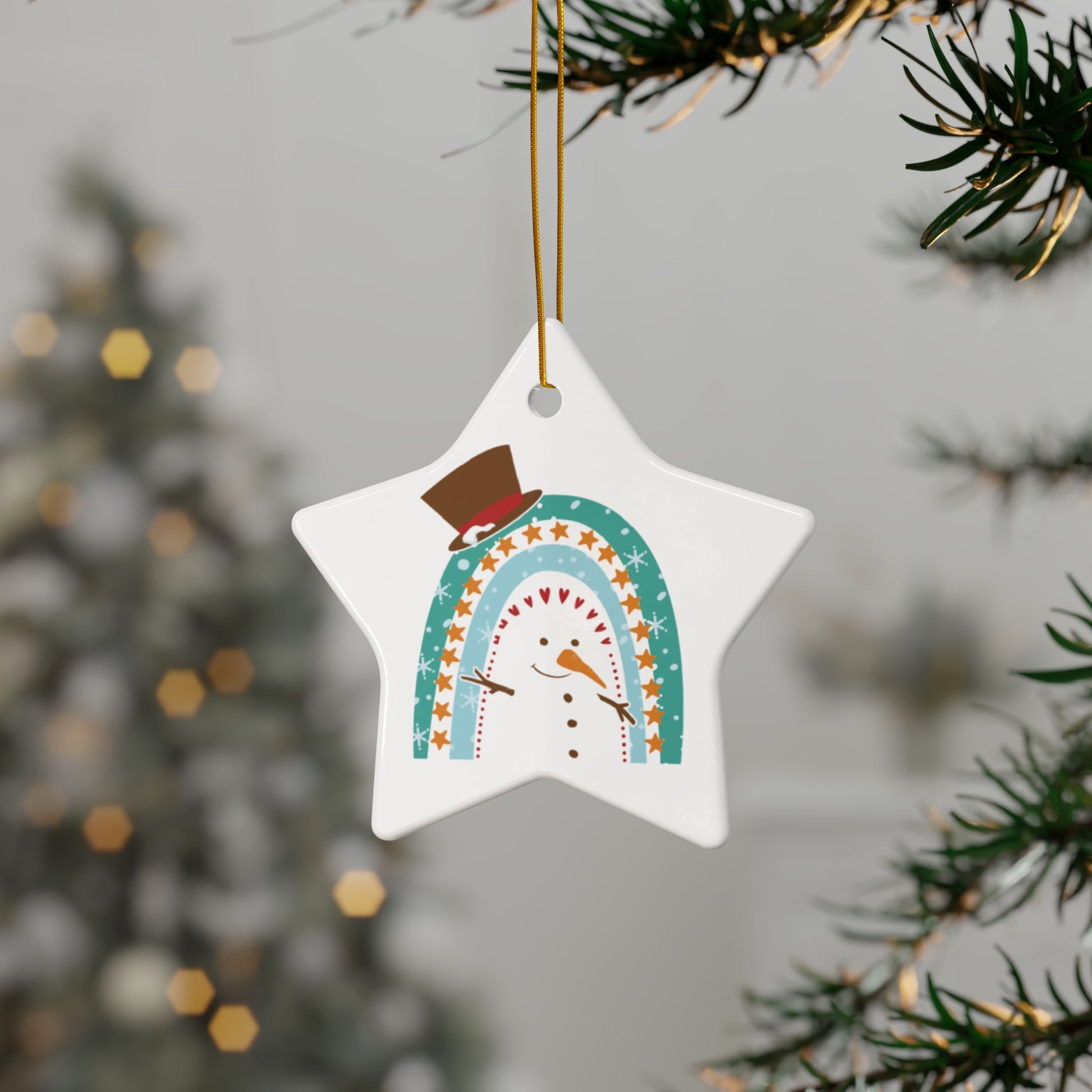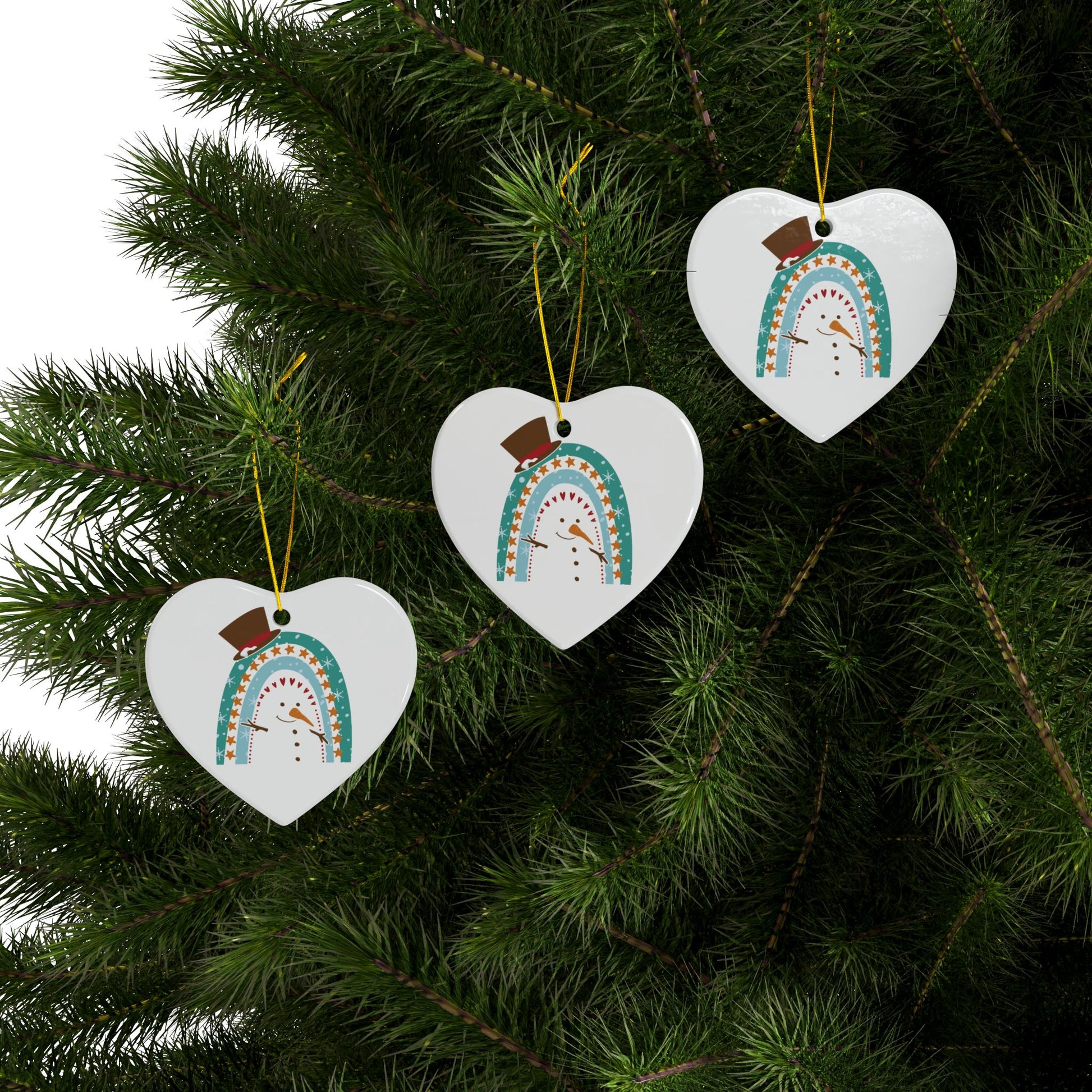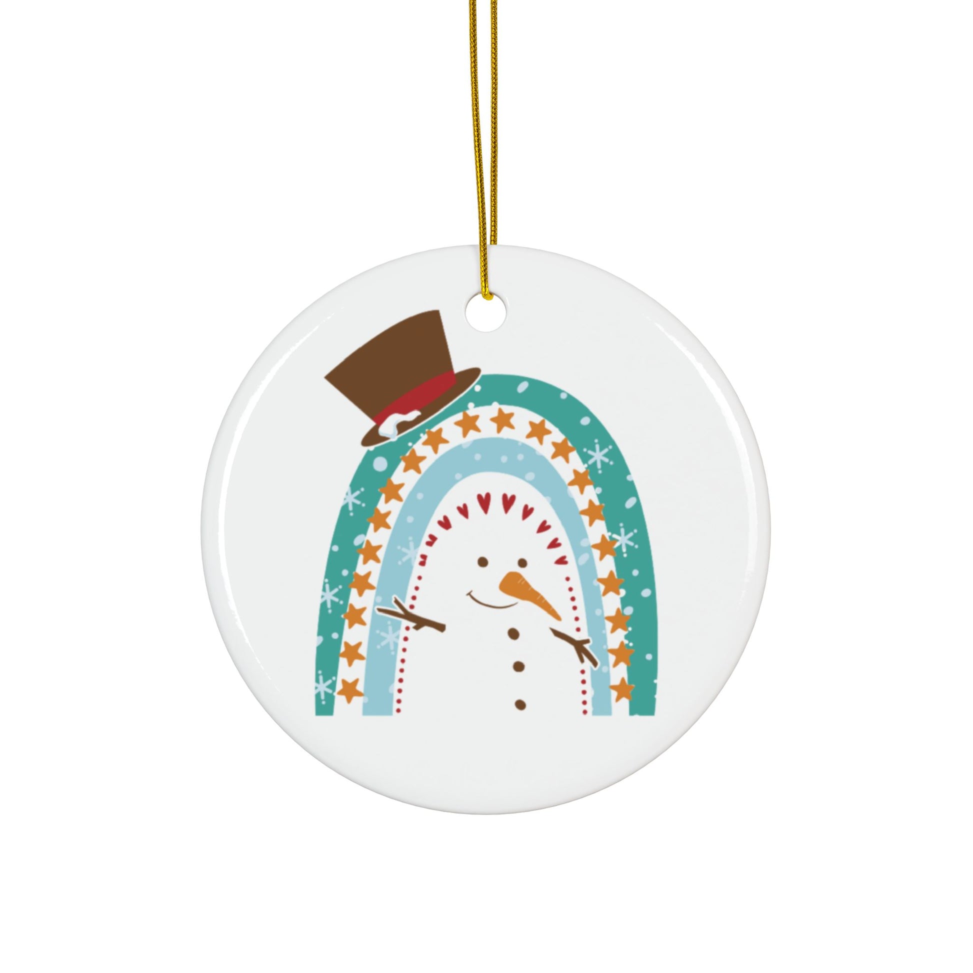 This adorable Rainbow Snowman Christmas Ornament features a snowman cleverly designed within a rainbow arch, complete with a classic top hat, twig arms, and a friendly smile. The soft colors and playful star and heart accents make this piece a perfect blend of modern and traditional holiday aesthetics.