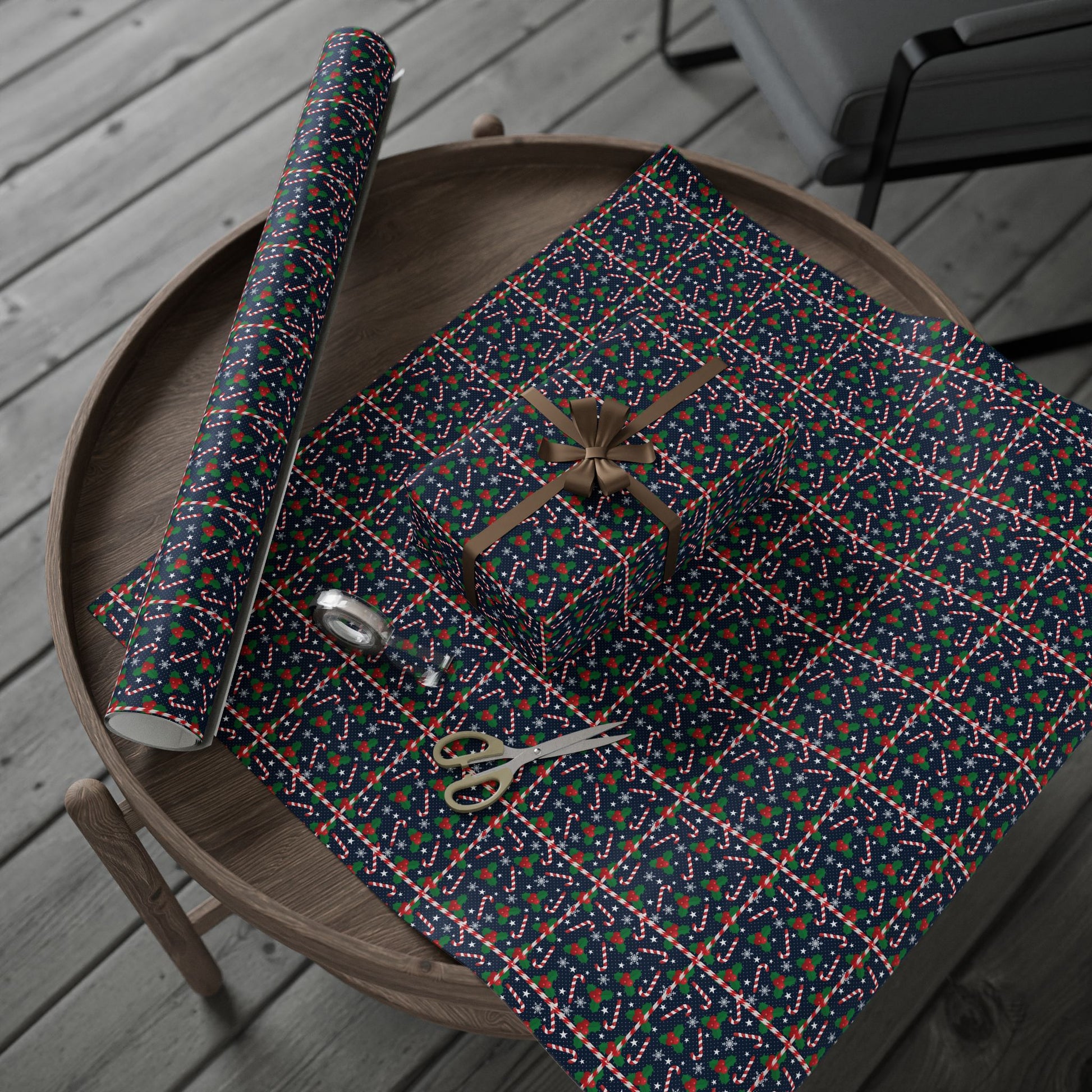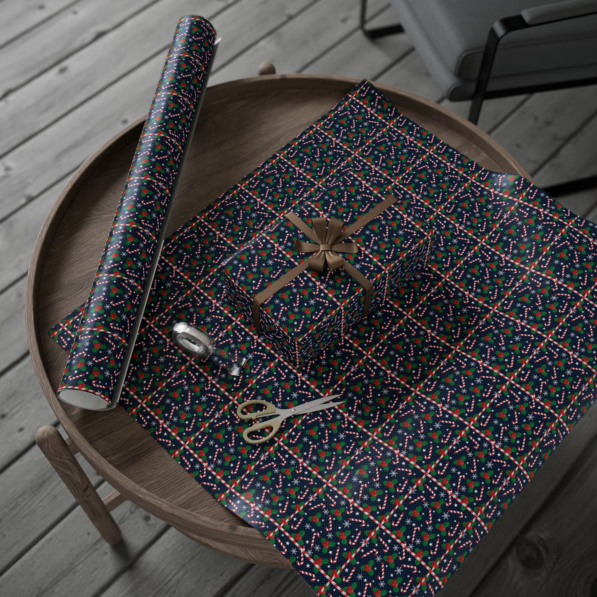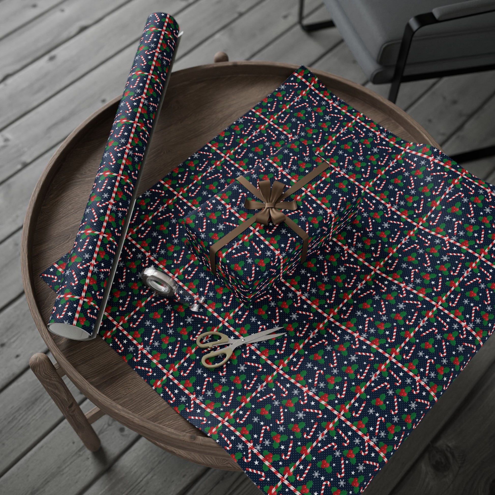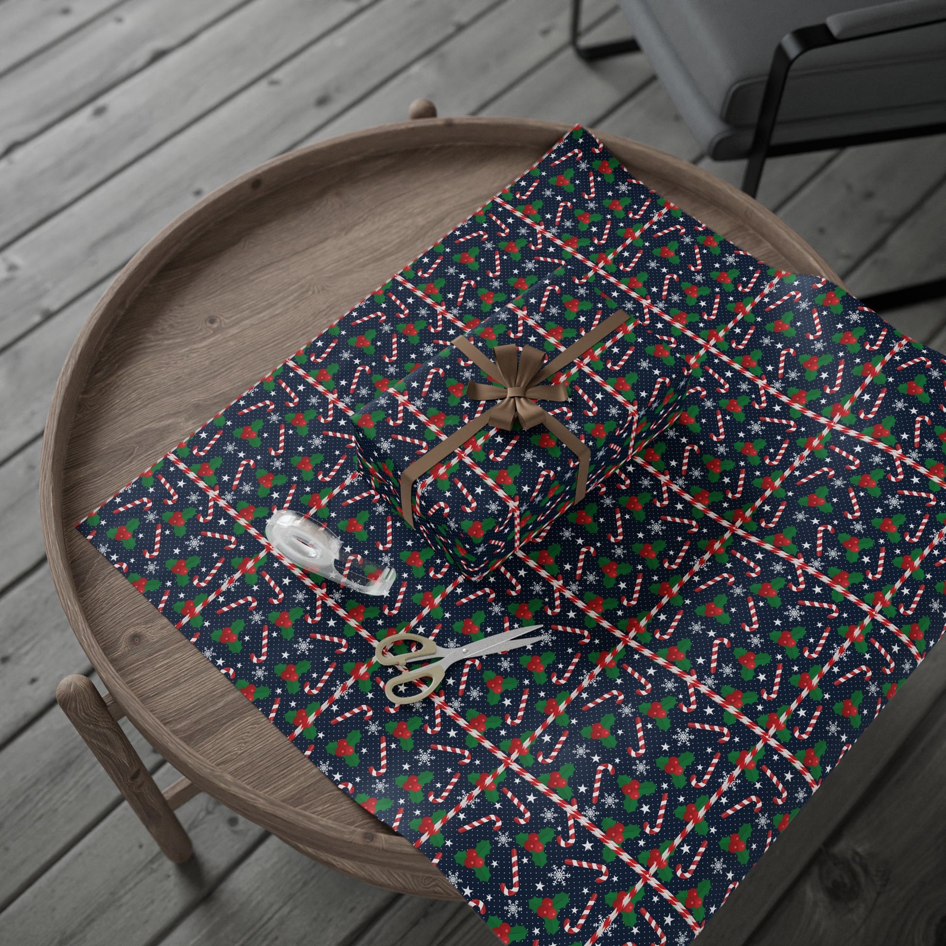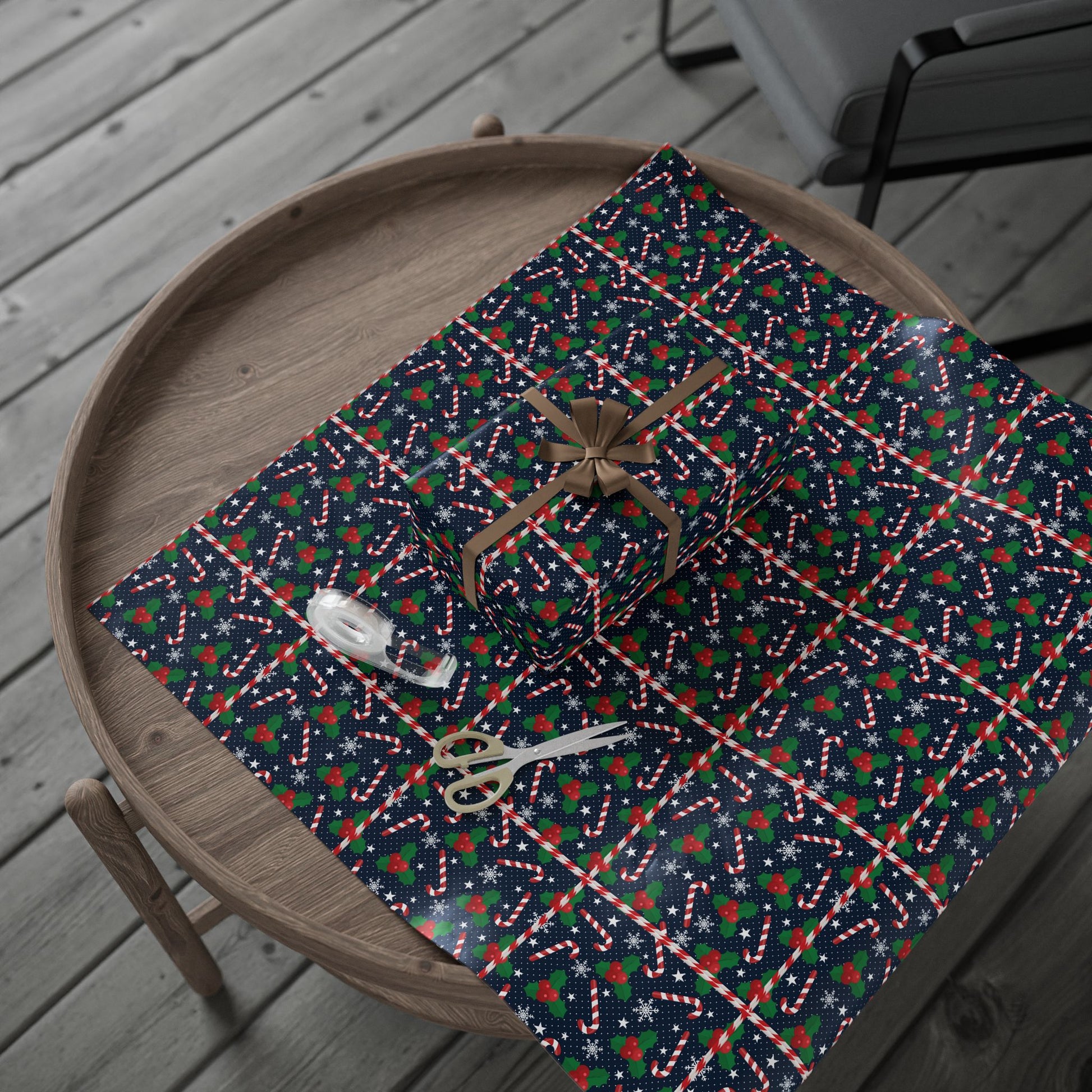 Christmas Candy Cane Wrapping Paper, Festive Holiday Gift Wrap, Holly and Snowflake Design Seasonal Christmas Paper