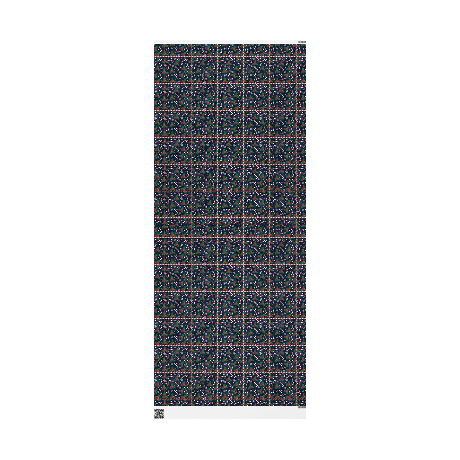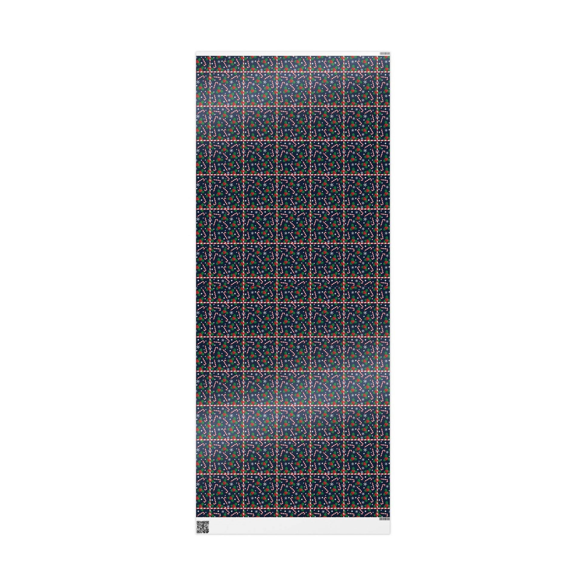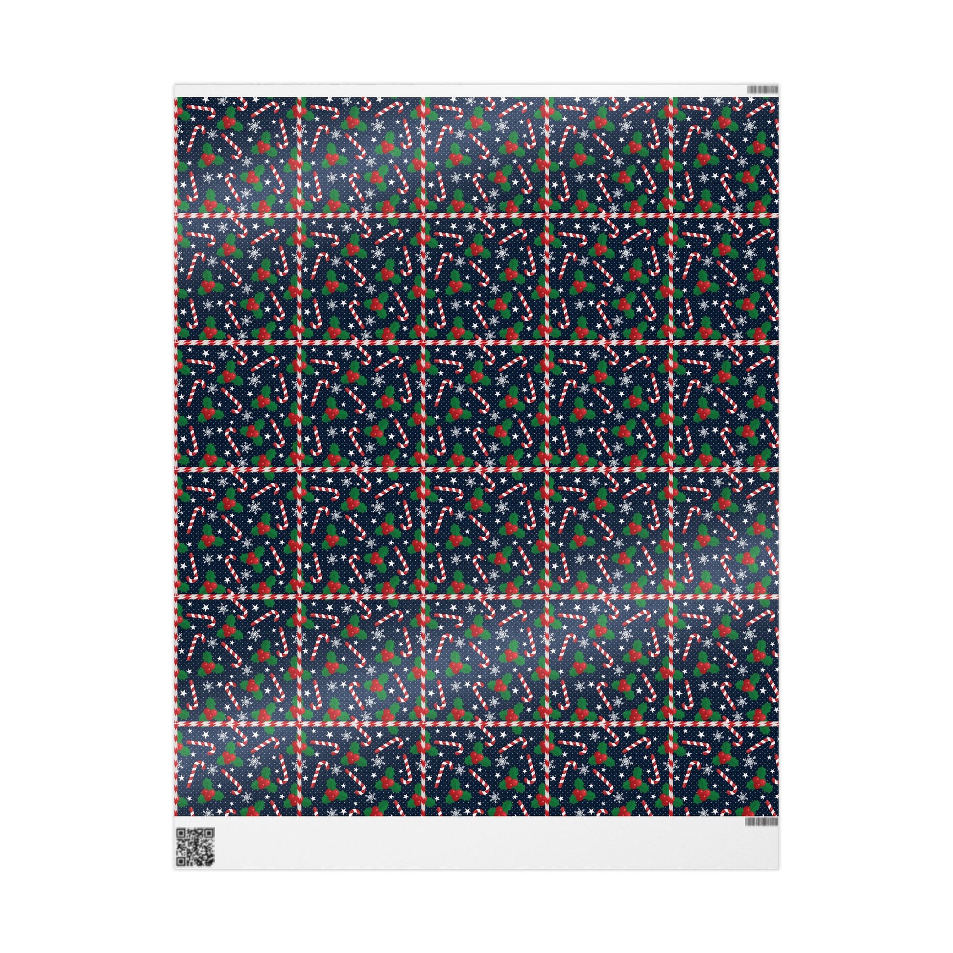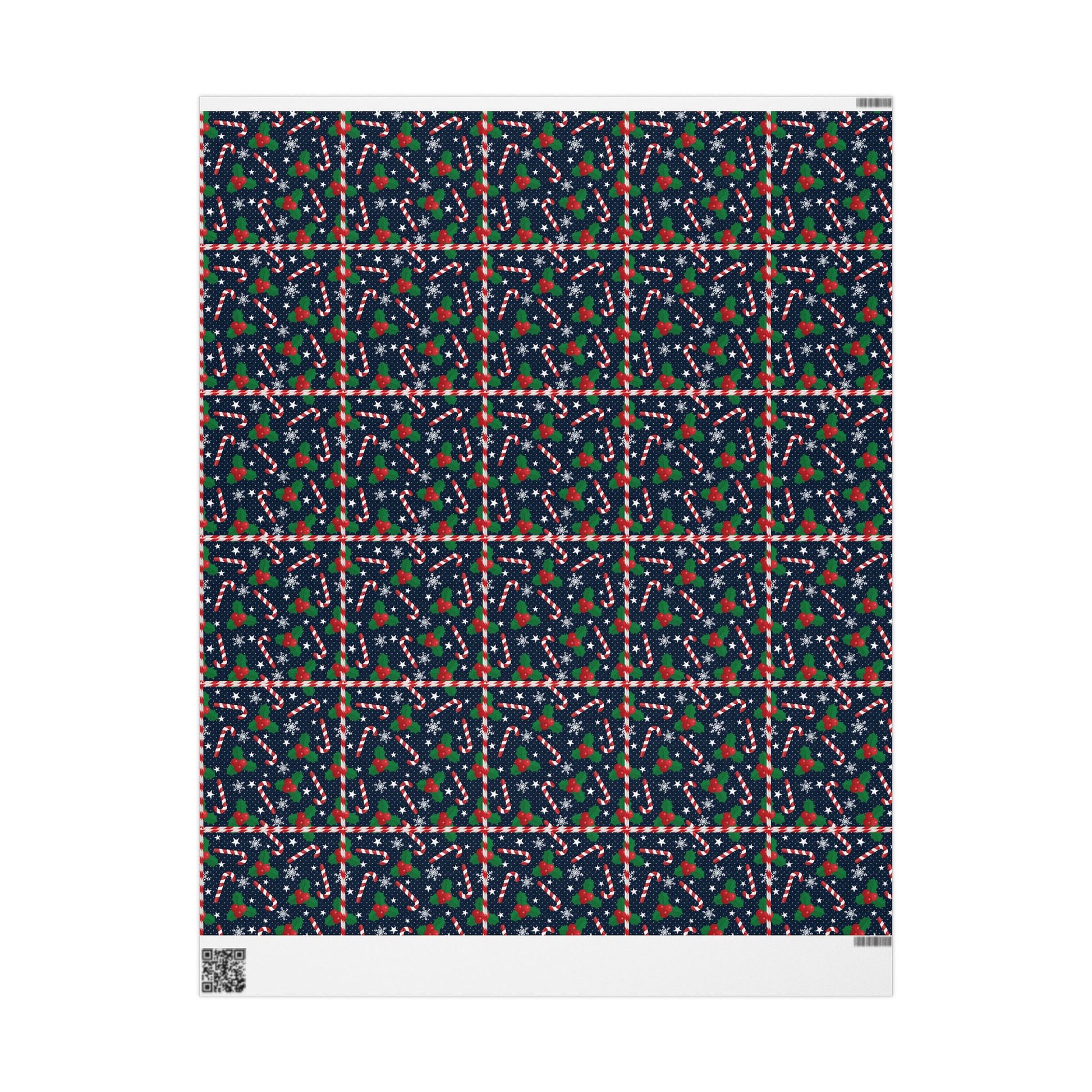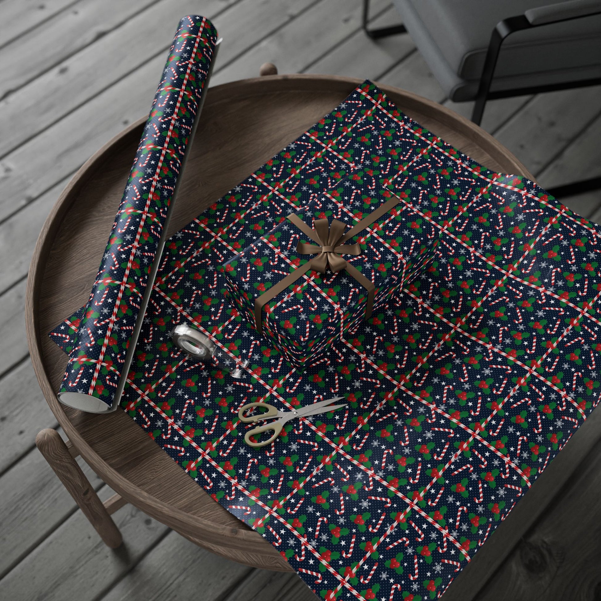 Wrap your presents in our Christmas Candy Cane Wrapping Paper, featuring a festive pattern of red candy canes, green holly leaves, and bright red berries set against a snowy starry background. Perfect for all your special gifts.