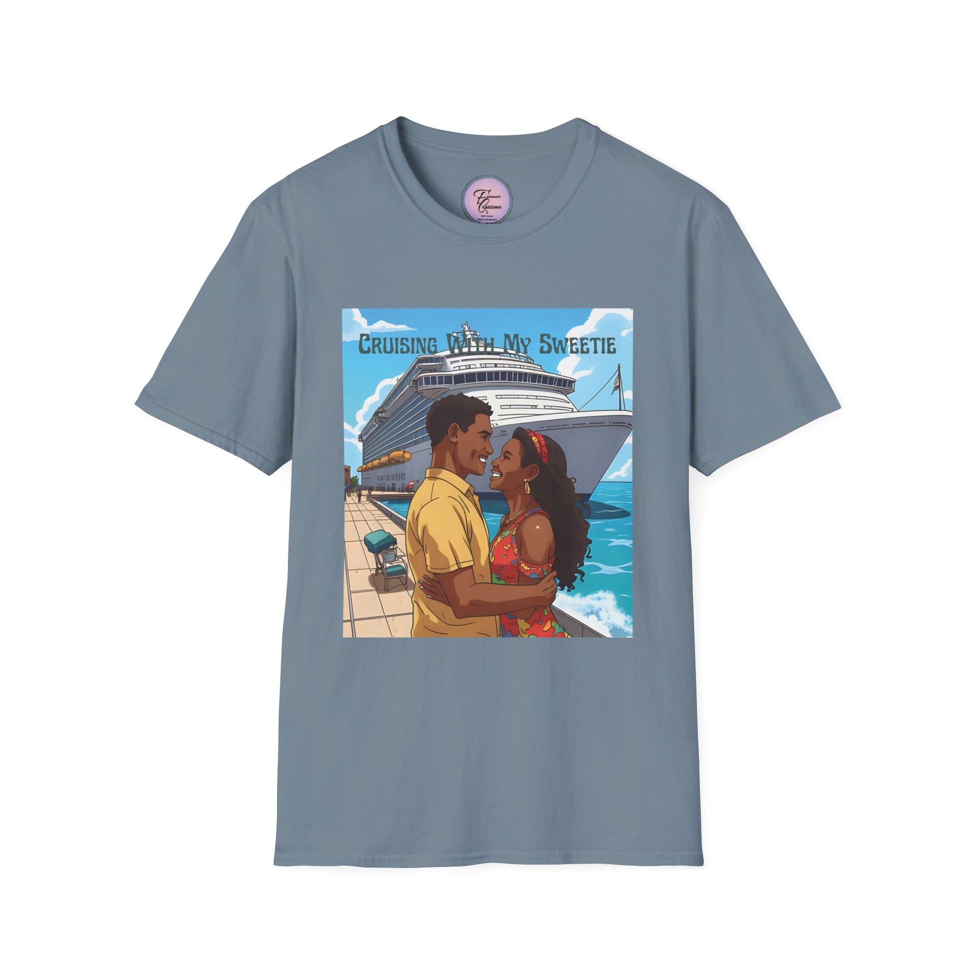 Celebrate love and adventure with this charming "Cruising With My Sweetie" t-shirt! Featuring a joyful Black couple embracing in front of a majestic cruise ship, this tee captures the magic of romantic getaways and sun-soaked memories. Perfect for matching couple outfits, cruise vacations, anniversary trips, or honeymoon escapes.