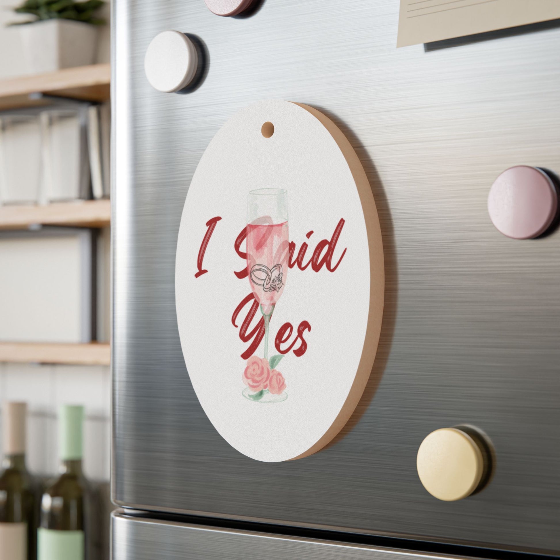 Celebrate your special moment with these beautifully crafted wooden "I Said Yes" Engagement Announcement Ornament Magnet, perfect for newly engaged couples! These heart, oval, and star-shaped ornaments features an elegant design with the words "I Said Yes" in a romantic script, accompanied by a delicate illustration of a champagne glass, wedding rings, and soft pink roses.
